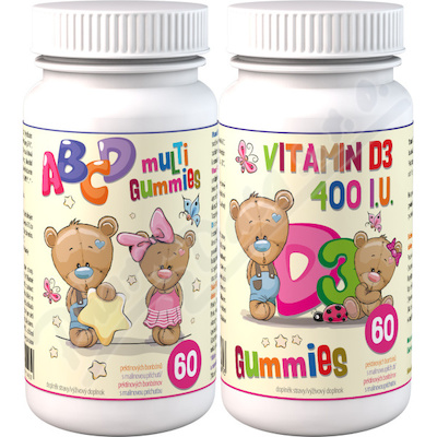 ABCD Multi Gummies + D3 Gummies 60 pektinových bonbónů 1+1 s malinovou příchutí jsou pektinové bonbóny s komplexem vitamínů A, B6, B12, C, D3, a E v balení po 60ks + 60ks.