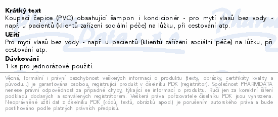 Koupací čepice (PVC) obsahující šampon i kondicionér - pro mytí vlasů bez vody - např. u pacientů (klientů zařízení sociální péče) na lůžku, při cestování atp.