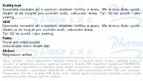 Epsomská minerální sůl s vysokým obsahem hořčíku a síranu. Má širokou škálu využití. Ideální je do koupelí pro uvolnění svalů, odbourání stresu. Tip! Sůl lze použít i jako peeling.
