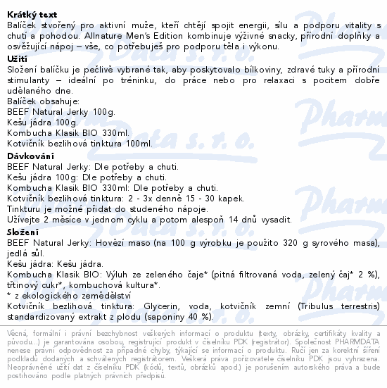 Balíček stvořený pro aktivní muže, kteří chtějí spojit energii, sílu a podporu vitality s chutí a pohodou. Allnature Men’s Edition kombinuje výživné snacky, přírodní doplňky a osvěžující nápoj – vše, co potřebuješ pro podporu těla i výkonu.