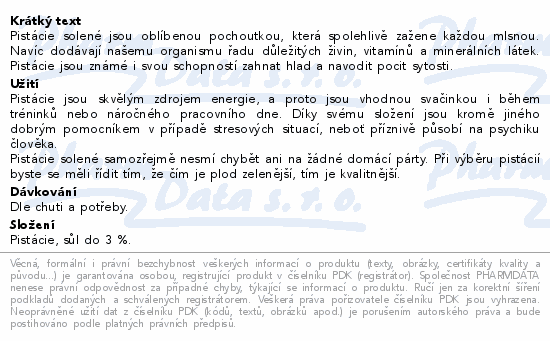Pistácie solené jsou oblíbenou pochoutkou, která spolehlivě zažene každou mlsnou. Navíc dodávají našemu organismu řadu důležitých živin, vitamínů a minerálních látek. Pistácie jsou známé i svou schopností zahnat hlad a navodit pocit sytosti.