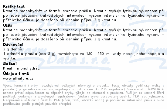 Kreatine monohydrát ve formě jemného prášku. Kreatin zvyšuje fyzickou výkonnost při po sobě jdoucích krátkodobých intervalech vysoce intenzivního fyzického výkonu – příznivého účinku je dosaženo při denním příjmu 3 g kreatinu.