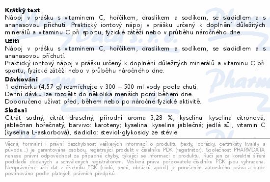 Nápoj v prášku s vitaminem C, hořčíkem, draslíkem a sodíkem, se sladidlem a s ananasovou příchutí. Praktický iontový nápoj v prášku určený k doplnění důležitých minerálů a vitaminu C při sportu, fyzické zátěži nebo v průběhu náročného dne.
