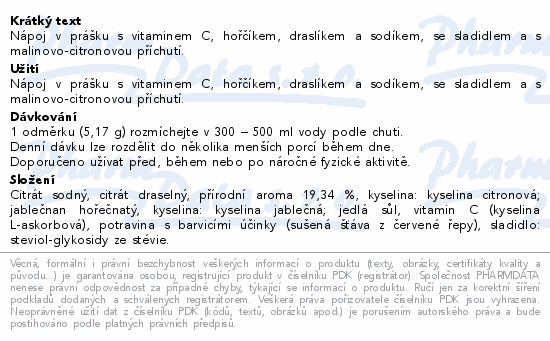 Nápoj v prášku s vitaminem C, hořčíkem, draslíkem a sodíkem, se sladidlem a s malinovo-citronovou příchutí.