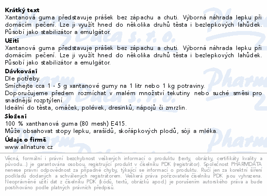 Xantanová guma představuje prášek bez zápachu a chuti. Výborná náhrada lepku při domácím pečení. Lze ji využít hned do několika druhů těsta i bezlepkových lahůdek. Působí jako stabilizátor a emulgátor.