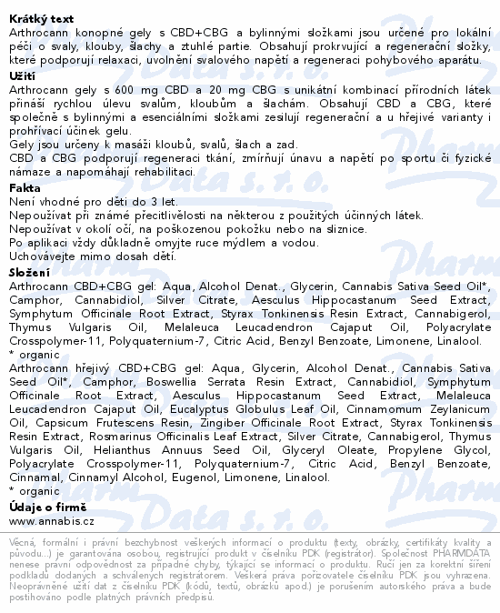 Arthrocann konopné gely s CBD+CBG a bylinnými složkami jsou určené pro lokální péči o svaly, klouby, šlachy a ztuhlé partie. Obsahují prokrvující a regenerační složky, které podporují relaxaci, uvolnění svalového napětí a regeneraci pohybového aparátu.