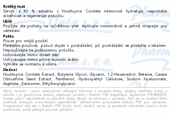 Sérum s 80 % extraktu z Houttuynia Cordata intenzivně hydratuje, napomáhá zklidňovat a regeneruje pokožku.