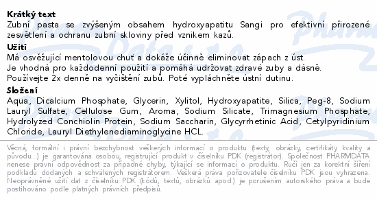 Zubní pasta se zvýšeným obsahem hydroxyapatitu Sangi pro efektivní přirozené zesvětlení a ochranu zubní skloviny před vznikem kazů.