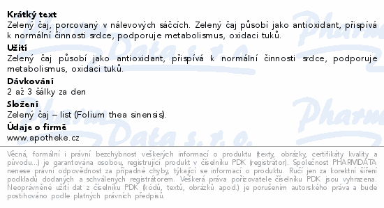 Zelený čaj, porcovaný v nálevových sáčcích. Zelený čaj působí jako antioxidant, přispívá k normální činnosti srdce, podporuje metabolismus, oxidaci tuků.