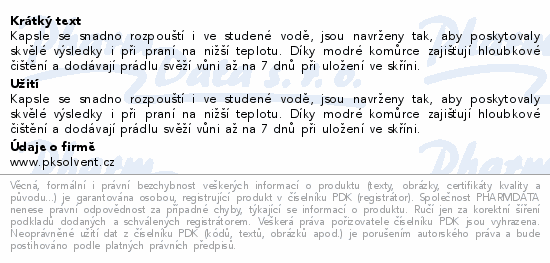 Kapsle se snadno rozpouští i ve studené vodě, jsou navrženy tak, aby poskytovaly skvělé výsledky i při praní na nižší teplotu. Díky modré komůrce zajišťují hloubkové čištění a dodávají prádlu svěží vůni až na 7 dnů při uložení ve skříni.