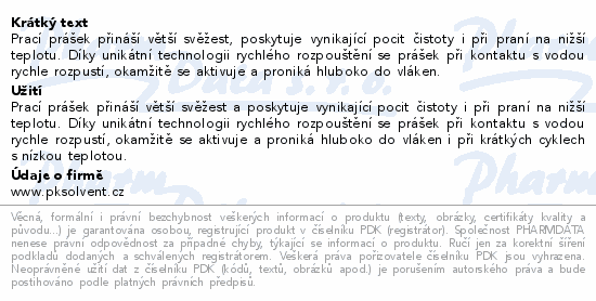 Prací prášek přináší větší svěžest, poskytuje vynikající pocit čistoty i při praní na nižší teplotu. Díky unikátní technologii rychlého rozpouštění se prášek při kontaktu s vodou rychle rozpustí, okamžitě se aktivuje a proniká hluboko do vláken.