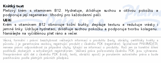 Pleťový krém s vitaminem B12. Hydratuje, zklidňuje suchou a citlivou pokožku a podporuje její regeneraci. Vhodný pro každodenní péči.