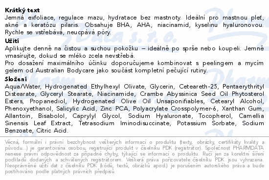 Jemná exfoliace, regulace mazu, hydratace bez mastnoty. Ideální pro mastnou pleť, akné a keratózu pilaris. Obsahuje BHA, AHA, niacinamid, kyselinu hyaluronovou. Rychle se vstřebává, neucpává póry.