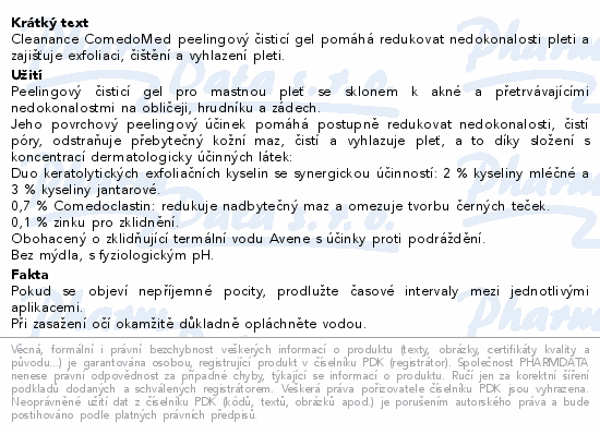 Cleanance ComedoMed peelingový čisticí gel pomáhá redukovat nedokonalosti pleti a zajišťuje exfoliaci, čištění a vyhlazení pleti.