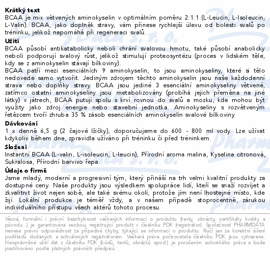 BCAA je mix větvených aminokyselin v optimálním poměru 2:1:1 (L-Leucin, L-Isoleucin, L-Valin). BCAA, jako doplněk stravy, vám přinese rychlejší úlevu od bolesti svalů po tréninku, jelikož napomáhá při regeneraci svalů.