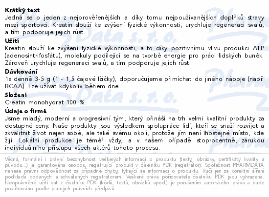 Jedná se o jeden z nejprověřenějších a díky tomu nejpoužívanějších doplňků stravy mezi sportovci. Kreatin slouží ke zvýšení fyzické výkonnosti, urychluje regeneraci svalů, a tím podporuje jejich růst.