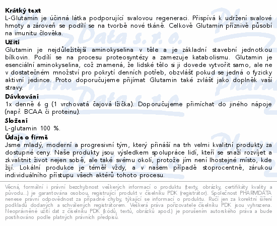 L-Glutamin je účinná látka podporující svalovou regeneraci. Přispívá k udržení svalové hmoty a zároveň se podílí se na tvorbě nové tkáně. Celkově Glutamin příznivě působí na imunitu člověka.