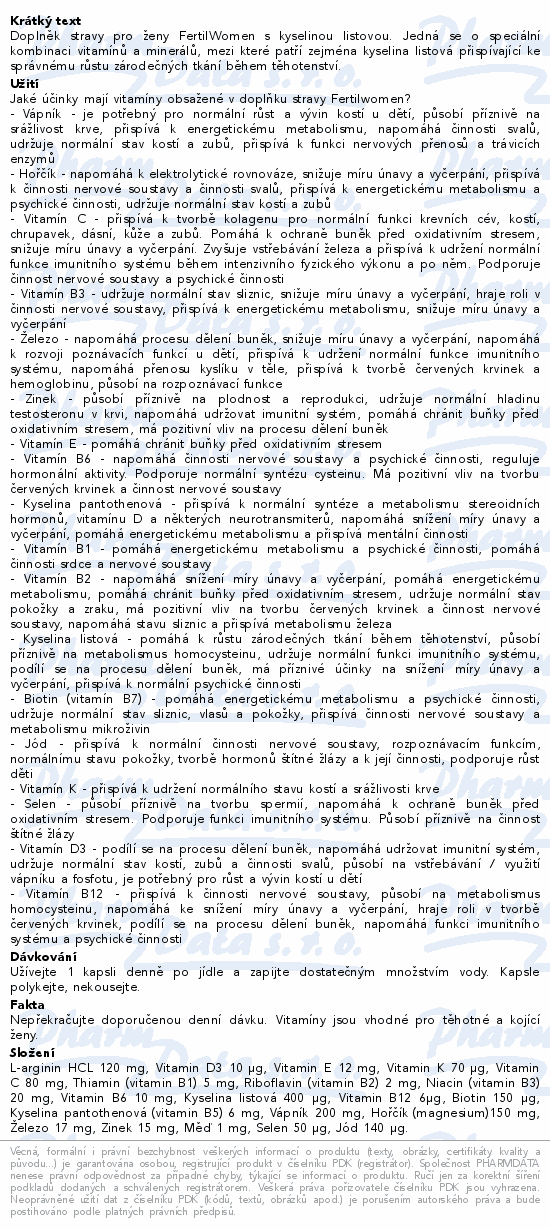 Doplněk stravy pro ženy FertilWomen s kyselinou listovou. Jedná se o speciální kombinaci vitamínů a minerálů, mezi které patří zejména kyselina listová přispívající ke správnému růstu zárodečných tkání během těhotenství.