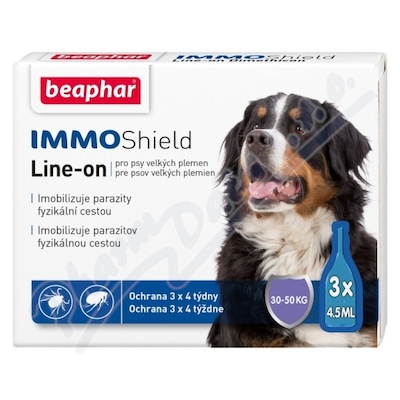 IMMO Shield Line-on pro veké psy je přípravek s účinnou látkou dimetikon (silikonový olej), který fyzikálním způsobem znehybňuje a zároveň likviduje blechy, klíšťata, komáry, roztoče, vši a všenky.