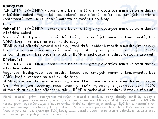 PERFEKTNÍ SVAČINKA - obsahuje 5 balení s 20 gramy ovocných minis ve tvaru tlapek v každém balení. Veganské, bezlepkové, bez ořechů, košer, bez umělých barviv a konzervantů, bez GMO. Ideální varianta na svačinku do školy.