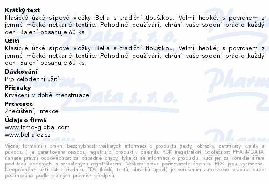Klasické úzké slipové vložky Bella s tradiční tloušťkou. Velmi hebké, s povrchem z jemné měkké netkané textilie. Pohodlné používání, chrání vaše spodní prádlo každý den. Balení obsahuje 60 ks.