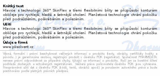Hlavice s technologií 360° SkinFlex a třemi flexibilními břity se přizpůsobí konturám obličeje pro rychlejší, hladší a šetrnější oholení. Planžetová technologie chrání pokožku před podrážděním, poškrábáním a pořezáním.