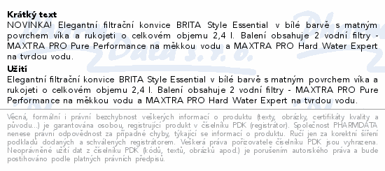 NOVINKA! Elegantní filtrační konvice BRITA Style Essential v bílé barvě s matným povrchem víka a rukojeti o celkovém objemu 2, 4 l. Balení obsahuje 2 vodní filtry - MAXTRA PRO Pure Performance na měkkou vodu a MAXTRA PRO Hard Water Expert na tvrdou vodu.