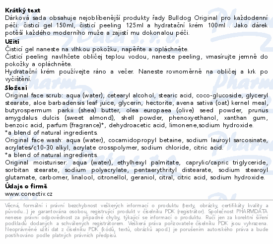 Dárková sada obsahuje nejoblíbenější produkty řady Bulldog Original pro každodenní péči: čisticí gel 150ml, čisticí peeling 125ml a hydratační krém 100ml . Jako dárek potěší každého moderního muže a zajistí mu dokonalou péči.