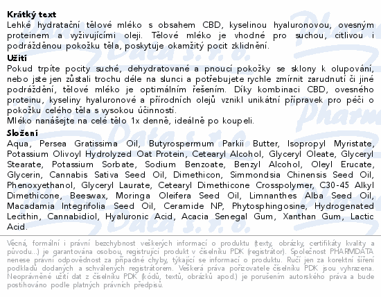 Lehké hydratační tělové mléko s obsahem CBD, kyselinou hyaluronovou, ovesným proteinem a vyživujícími oleji. Tělové mléko je vhodné pro suchou, citlivou i podrážděnou pokožku těla, poskytuje okamžitý pocit zklidnění.
