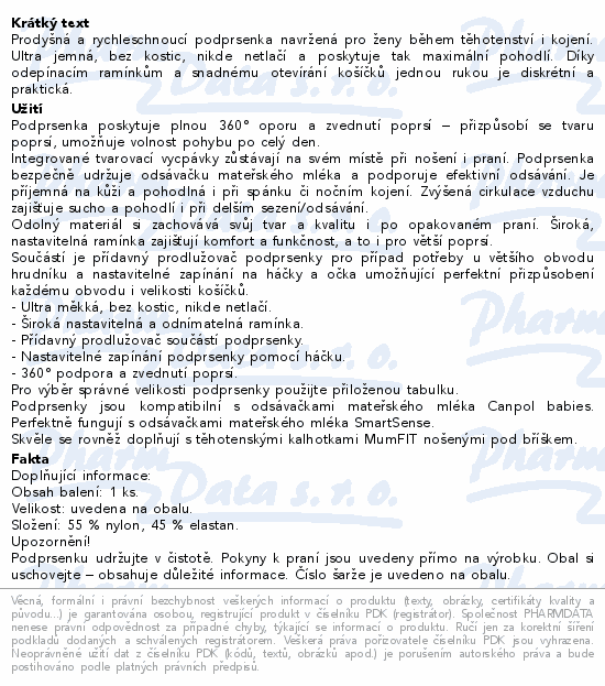 Prodyšná a rychleschnoucí podprsenka navržená pro ženy během těhotenství i kojení. Ultra jemná, bez kostic, nikde netlačí a poskytuje tak maximální pohodlí. Díky odepínacím ramínkům a snadnému otevírání košíčků jednou rukou je diskrétní a praktická.