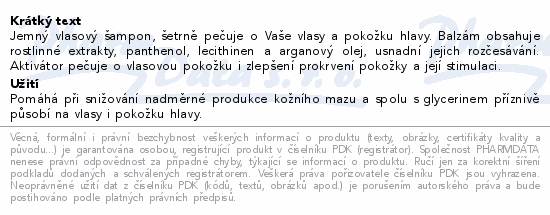 Jemný vlasový šampon, šetrně pečuje o Vaše vlasy a pokožku hlavy. Balzám obsahuje rostlinné extrakty, panthenol, lecithinen a arganový olej, usnadní jejich rozčesávání. Aktivátor pečuje o vlasovou pokožku i zlepšení prokrvení pokožky a její stimulaci.