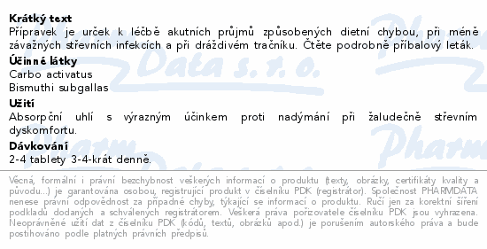 Farmakoterapeutická skupina: Antidiaroika, střevní protizánětlivá a protiinfekční léčiva - Přípravky obsahující aktivní uhlí - Přípravky obsahující aktivní uhlí, kombinace