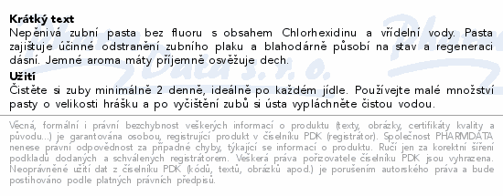 Nepěnivá zubní pasta bez fluoru s obsahem Chlorhexidinu a vřídelní vody. Pasta zajištuje účinné odstranění zubního plaku a blahodárně působí na stav a regeneraci dásní. Jemné aroma máty příjemně osvěžuje dech.