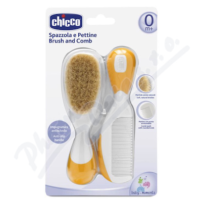 Chicco hřeben z přírodních vláken a hřeben se zaoblenými špičkami jsou vhodné pro jemné vlásky dítěte.