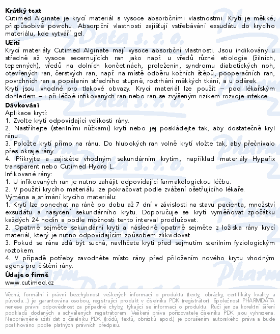 Cutimed Alginate je krycí materiál s vysoce absorbčními vlastnostmi. Krytí je měkké, přizpůsobivé povrchu. Absorpční vlastnosti zajišťují vstřebávání exsudátu do krycího materiálu, kde vytváří gel.