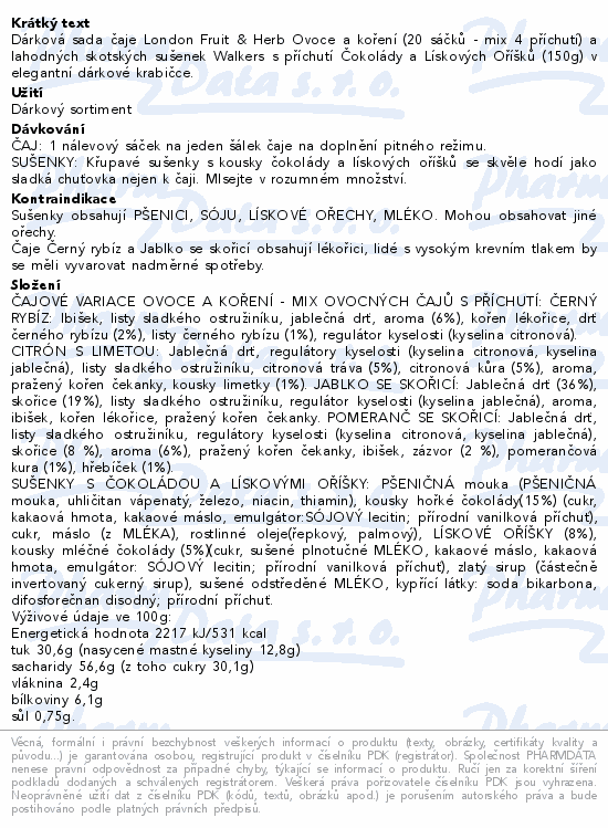 Dárková sada čaje London Fruit & Herb Ovoce a koření (20 sáčků - mix 4 příchutí) a lahodných skotských sušenek Walkers s příchutí Čokolády a Lískových Oříšků (150g) v elegantní dárkové krabičce.