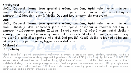Vložky Depend Normal jsou speciálně určeny pro ženy trpící velmi lehkým únikem moči. Obsahují ultra absorpční jádro pro rychlé odvedení a zadržení tekutiny a zamezení nežádoucích pachů. Vložky Depend jsou anatomicky tvarované.