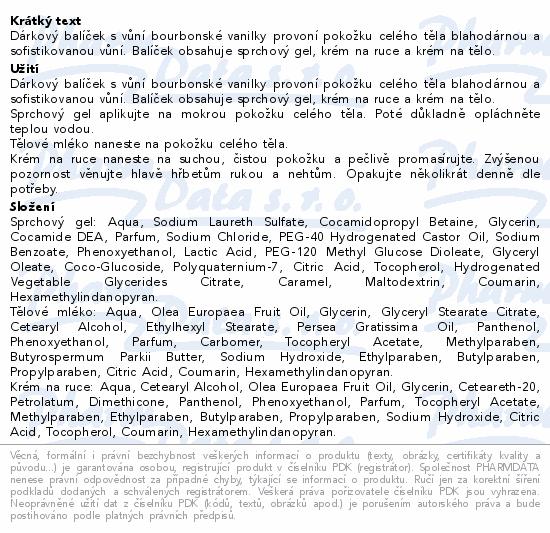 Dárkový balíček s vůní bourbonské vanilky provoní pokožku celého těla blahodárnou a sofistikovanou vůní. Balíček obsahuje sprchový gel, krém na ruce a krém na tělo.