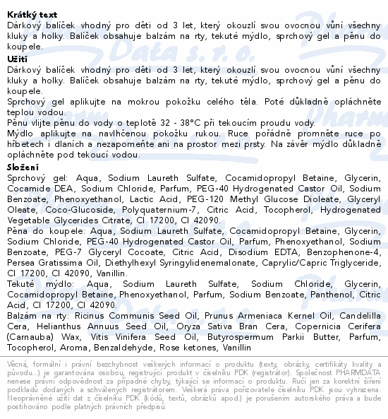 Dárkový balíček vhodný pro děti od 3 let, který okouzlí svou ovocnou vůní všechny kluky a holky. Balíček obsahuje balzám na rty, tekuté mýdlo, sprchový gel a pěnu do koupele.
