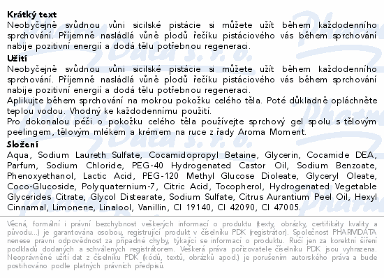 Neobyčejně svůdnou vůni sicilské pistácie si můžete užít během každodenního sprchování. Příjemně nasládlá vůně plodů řečíku pistáciového vás během sprchování nabije pozitivní energií a dodá tělu potřebnou regeneraci.