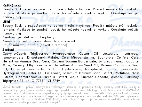 Beauty Stick je rozjasňovač na obličej i tělo v tyčince. Prozářit můžete tvář, dekolt i ramena. Aplikace je snadná, použít ho můžete kdekoli a kdykoli. Obsahuje pečující ricinový olej.