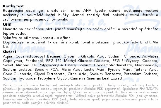 Rozjasňující čisticí gel s exfoliační směsí AHA kyselin účinně odstraňuje veškeré nečistoty a odumřelé kožní buňky. Jemné tenzidy čistí pokožku velmi šetrně a zachovávají její přirozenou rovnováhu.