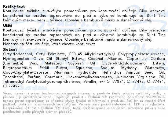 Konturovací tyčinka je skvělým pomocníkem pro konturování obličeje. Díky krémové konzistenci se snadno zapracovává do pleti a výborně kombinuje se Skint Tint krémovým make-upem v tyčince. Obsahuje bambucké máslo a slunečnicový olej.