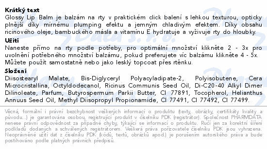 Glossy Lip Balm je balzám na rty v praktickém click balení s lehkou texturou, opticky plnější díky mírnému plumping efektu a jemným chladivým efektem. Díky obsahu ricinového oleje, bambuckého másla a vitamínu E hydratuje a vyživuje rty do hloubky.