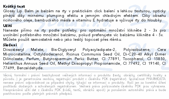 Glossy Lip Balm je balzám na rty v praktickém click balení s lehkou texturou, opticky plnější díky mírnému plumping efektu a jemným chladivým efektem. Díky obsahu ricinového oleje, bambuckého másla a vitamínu E hydratuje a vyživuje rty do hloubky.