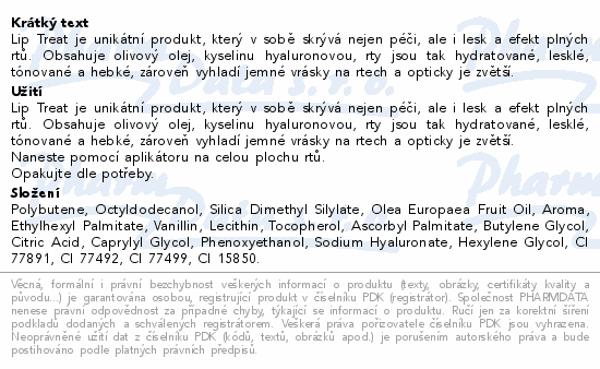 Lip Treat je unikátní produkt, který v sobě skrývá nejen péči, ale i lesk a efekt plných rtů. Obsahuje olivový olej, kyselinu hyaluronovou, rty jsou tak hydratované, lesklé, tónované a hebké, zároveň vyhladí jemné vrásky na rtech a opticky je zvětší.