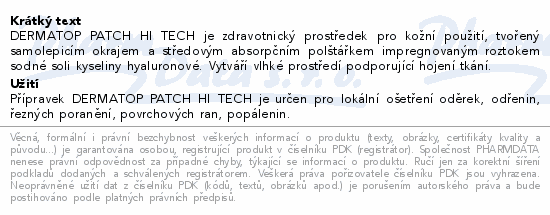 DERMATOP PATCH HI TECH je zdravotnický prostředek pro kožní použití, tvořený samolepicím okrajem a středovým absorpčním polštářkem impregnovaným roztokem sodné soli kyseliny hyaluronové. Vytváří vlhké prostředí podporující hojení tkání.