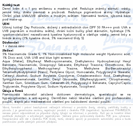 Denní krém 4 v 1 pro smíšenou a mastnou pleť. Redukuje známky stárnutí: vrásky, jemné linky, ztrátu pevnosti a pružnosti. Redukuje pigmentové skvrny. Hydratuje. Chrání před UVA