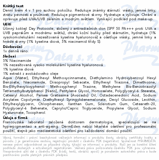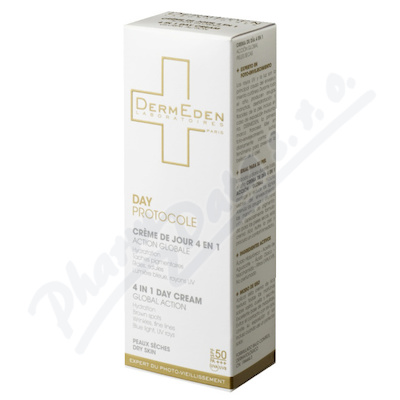 Denní krém 4 v 1 pro suchou pokožku. Redukuje známky stárnutí: vrásky, jemné linky, ztrátu pevnosti a pružnosti. Redukuje pigmentové skvrny. Hydratuje a vyživuje. Chrání a opravuje před UVA