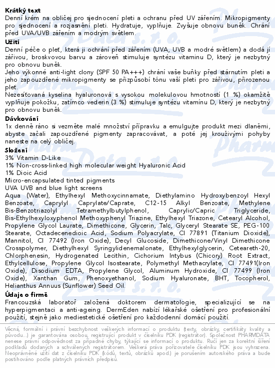 Denní krém na obličej pro sjednocení pleti a ochranu před UV zářením. Mikropigmenty pro sjednocení a rozjasnění pleti. Hydratuje, vyplňuje. Zvyšuje obnovu buněk. Chrání před UVA